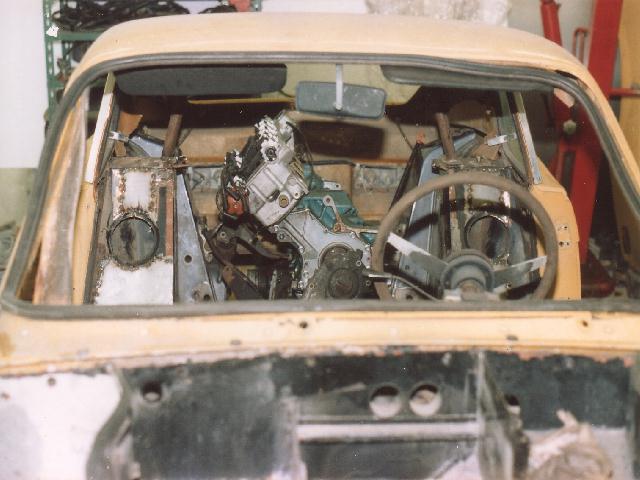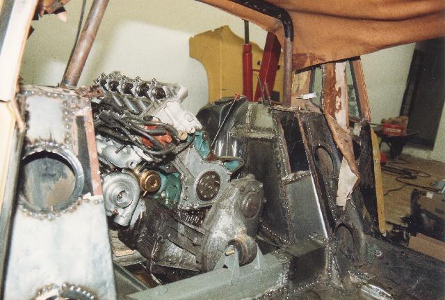 S1.4: Hier kann man deutlich sehen, wie nahe der Motor am Innenraum sitzt. Die 3-Punkt Aggregatlagerung habe ich vom 900 übernommen, einschließlich der 900 Quertraverse für das vordere Lager. Für das Lager musste ich sogar eine Beule in die Schottwand zum Innenraum einbringen. Diese fertigte ich als Blech-Honeycomp-GFK-Sandwich an. Den Zündverteiler im Bild habe ich nicht verwendet, da er im Beifahrersitz stecken würde. Nach betteln bei Saab-Schweden bekam ich einzigartige Teile für eine 900-DI-Anlage, nämlich die Ölpumpe mit Kurbelwellensensor und Riemenscheibe mit entsprechender Aufnahme für Sensorteile. Meines Wissens gibt es diese Teile nicht zu kaufen: