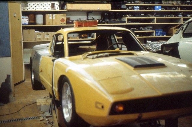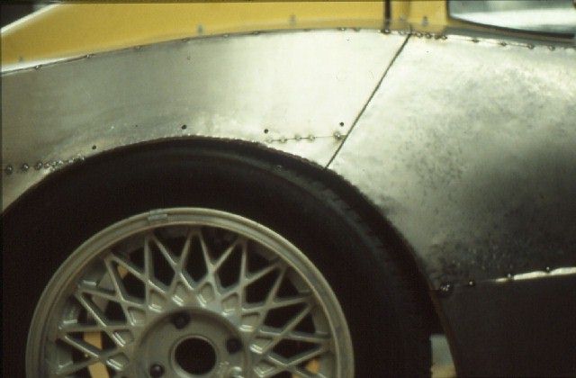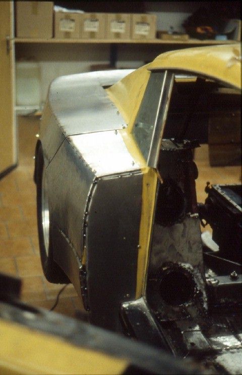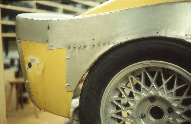 S3b.3: Auf diesem Bild sieht man die verbreiterte Karosse. An der Fronthaube ist die Blechform bereits entfernt. Das weiß Laminierte überlappt auf der Innenseite. Um eine gute Verbindung zu gewährleisten, wurde der Stoß sehr stark angefast. Vor den Karosseriearbeiten wurde das Fahrwerk gebaut.