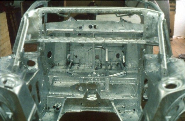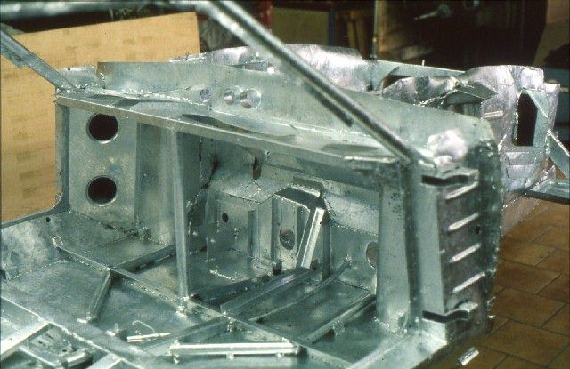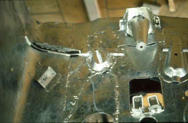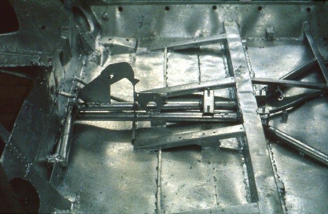 S3c.2: Hier sieht man den Boden im Innenraum mit dem Querträger und den Sitzaufnahmen. Außerdem sieht man zusätzliche Aufnahmen für Handbremse, Schaltbock und Zusatzboden sowie die Kühlwasserrohre.