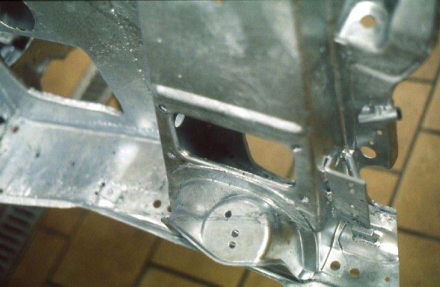 S3c.4: Hier sieht man den hinteren Fahrwerksdom (aus dem '86iger 900er) mit der Aufnahme für das rechte Motorlager und Aufnahmen für die rechte Spurstange.