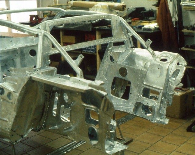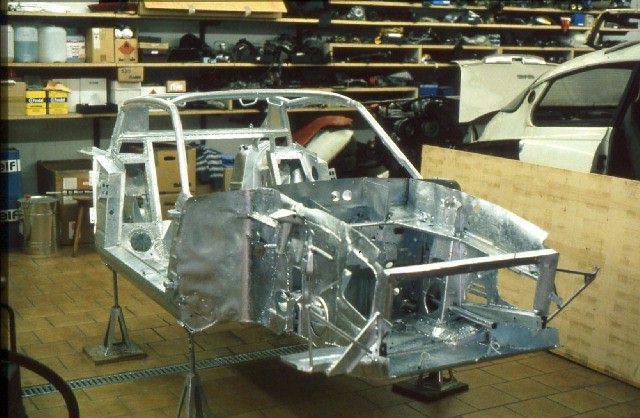 S3c.5: Bei dieser Perspektive aus dem Motorraum sieht man von hinten nach vorne die Fahrwerksdome, den Auslauf des Überrollkäfigs, den hinteren Fensterausschnitt, die Wasserrohre, das vordere Aggregatelager, der Schottwandausschnitt, die Wasserrohre vorne und die Bremskraftverstärkeraufnahme.